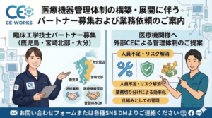 事業用フライヤー作成のためHPレイアウトを一部変更しました。 お知らせ URLをコピーしました! 認定医療機器管理臨床工学技士試験終わりました???? 臨床工学技士告示研修受講中です CE-WORKS 代表 中村隆志 中村隆志 技士経験年数19年、フリーランスになって4年目です。 認定資格と臨床経験を生かして、鹿児島県内で臨床工学技士のフリーランス事業を展開しています。小さなことからコツコツと。 便利屋中村がんばります('ω')ノ 関連記事 「KAGOSHIMA NEXT STAGE」登壇のご報告😊 2026年4月3日 フリーランス臨床工学技士として5年を迎えます! 2026年4月1日 医療機器管理体制の構築・展開に伴うパートナー募集および業務依頼のご案内 2026年3月21日 「KAGOSHIMA NEXT STAGE」登壇のお知らせ 2026年3月8日 鹿児島県信用保証協会様情報誌「保証月報2026年3月号」に掲載されました! 2026年3月5日 第36回日本臨床工学会 登壇のお知らせ 2026年3月3日 生体情報モニタ用点検治具【AMPS-1】レンタル開始!!! 2026年2月26日 「CE図鑑」寄稿のお知らせ 2026年2月14日